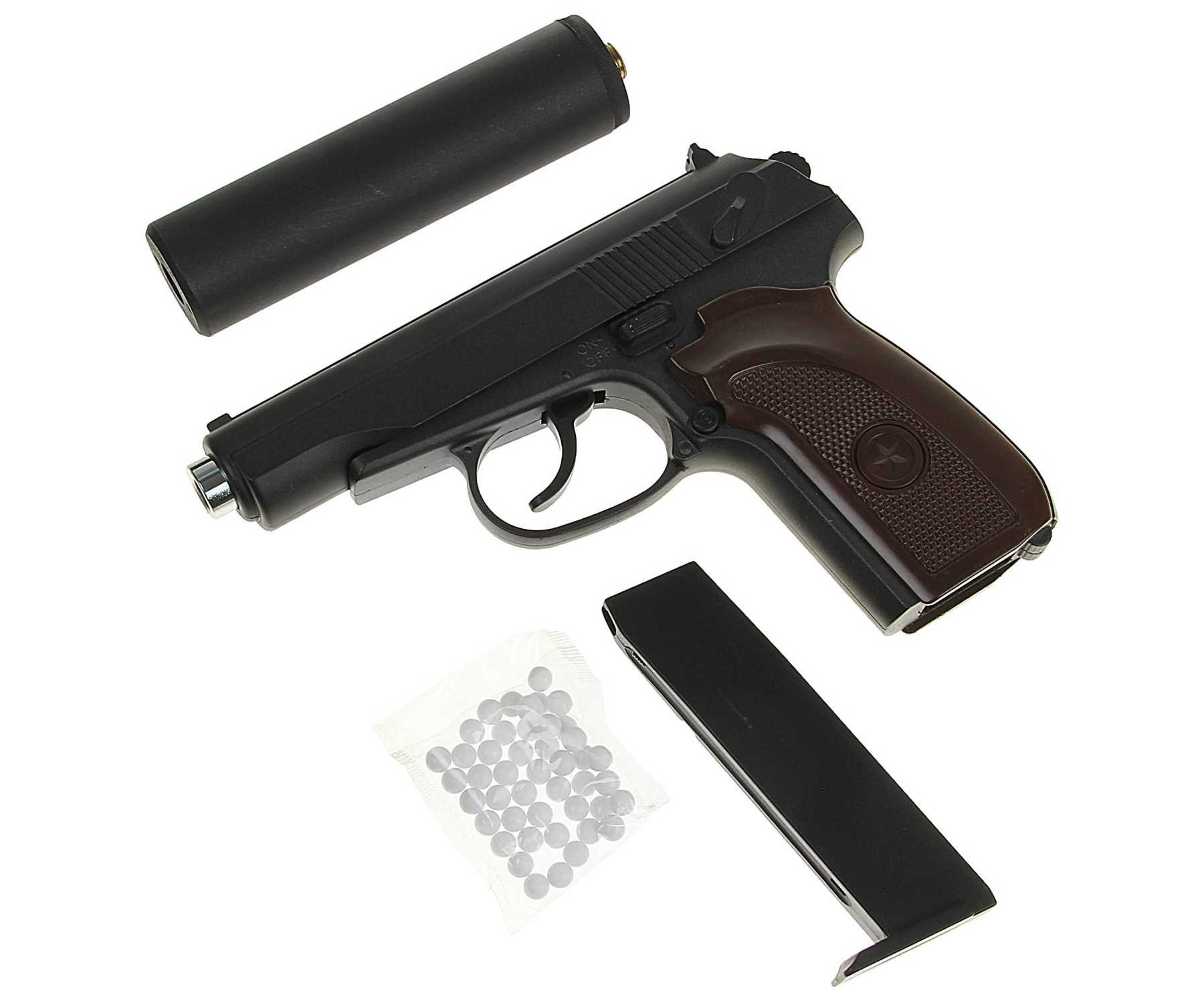 - Vybavení: pistole, zásobník, odnímatelný tlumič a vzorek BB