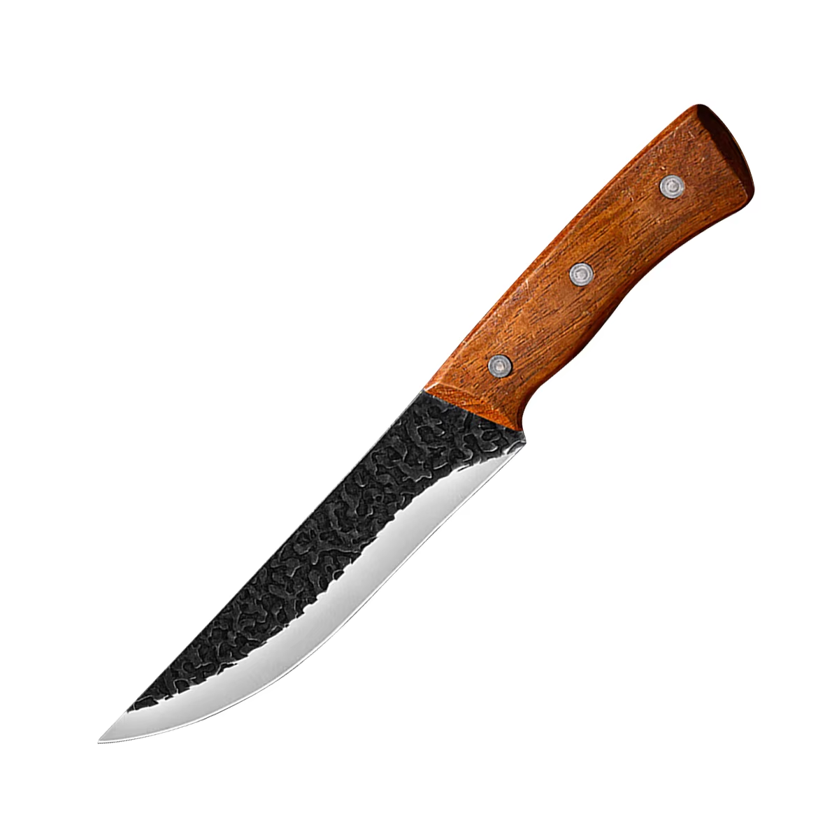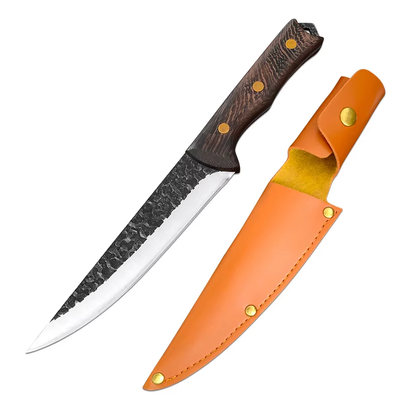 Ručně kovaný lovecký nůž (sekáček) o celkové délce 26 cm. Čepel dlouhá 16 cm z nerezové oceli nabízí pevné a přesné ostří, rukojeť ze dřeva, které se drží pohodlně v ruce. Součástí je dřevěné pouzdro pro bezpečné nošení a skladování — praktický nástroj pro lov, kempování i běžné kuchyňské použití.