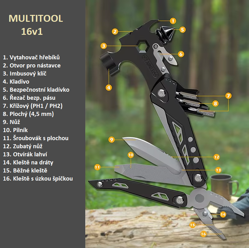 - Funkce: kladivo, mini trhací kladivo, kleště, nůž, pilka, řezačka pásu, otvírák, pilník, drážkový a křížový šroubovák (PH1/PH2, 4,5 mm), vytahovač hřebíků, imbusový klíč, štípací kleště